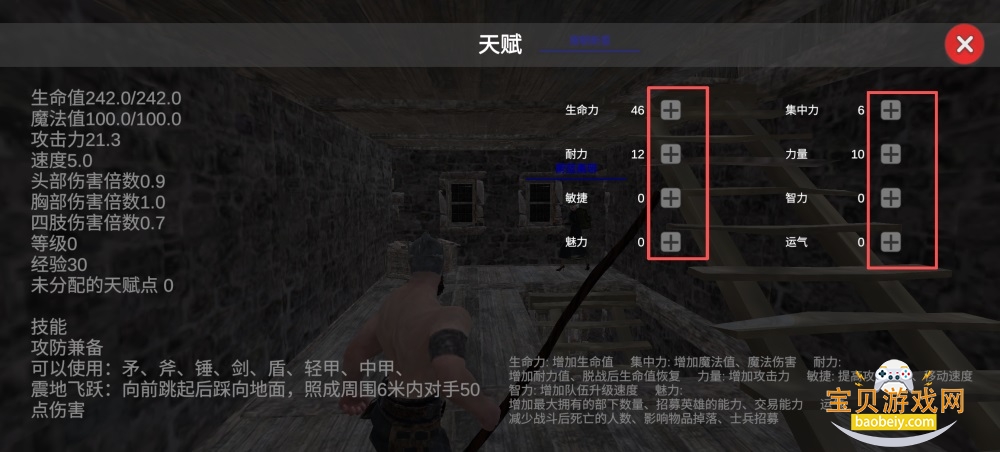 5、你可以为生命力、耐力、敏捷、魅力等属性分配天赋点,点击对应属性的【+】图标为该属性加点。