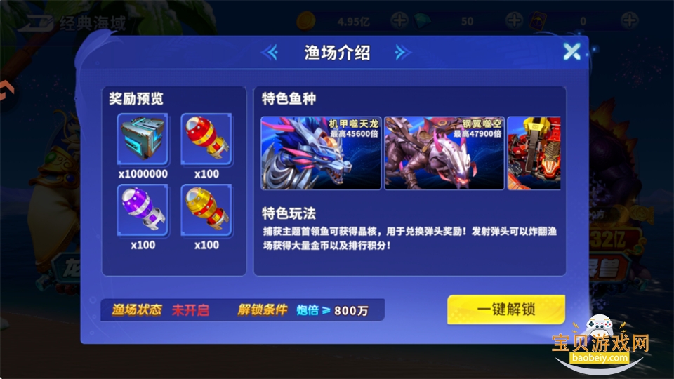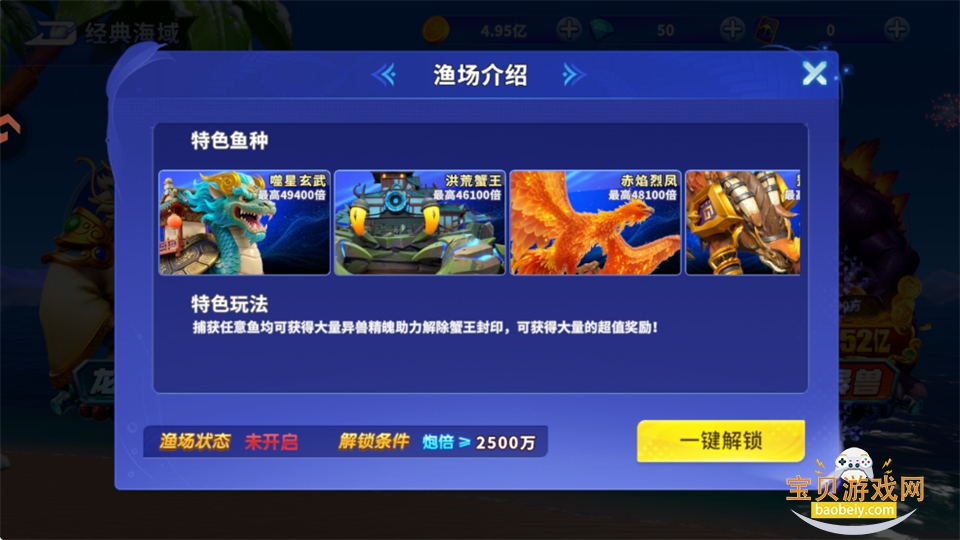 特色玩法:捕获任意鱼均可获得大量异兽精魄助力解除蟹王封印,可获得大量的超值奖励!