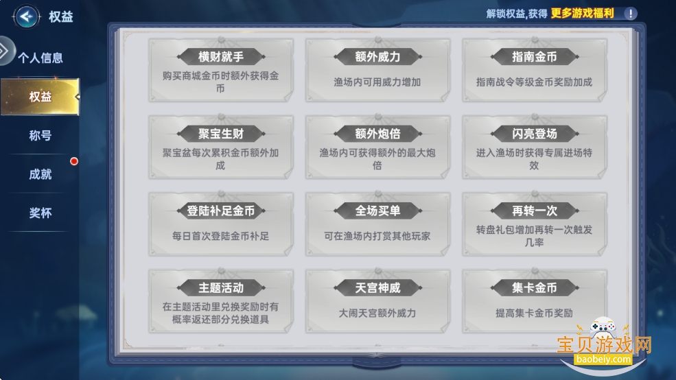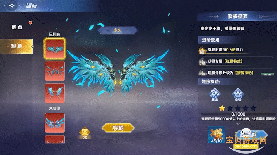 你可通过购买翅膀、炮台等物品解锁相关权益,参与更多精彩内容。