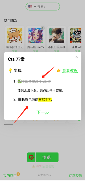 3、根据系统提示下载并安装cts组件,下载完成重启你的手机即可