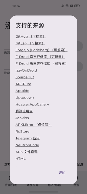 1、多源获取:支持从GitHub、GitLab、Codeberg等开源平台,以及F-Droid、APKPure、Aptoide、Uptodown等主流第三方应用市场获取应用更新,覆盖范围广泛。