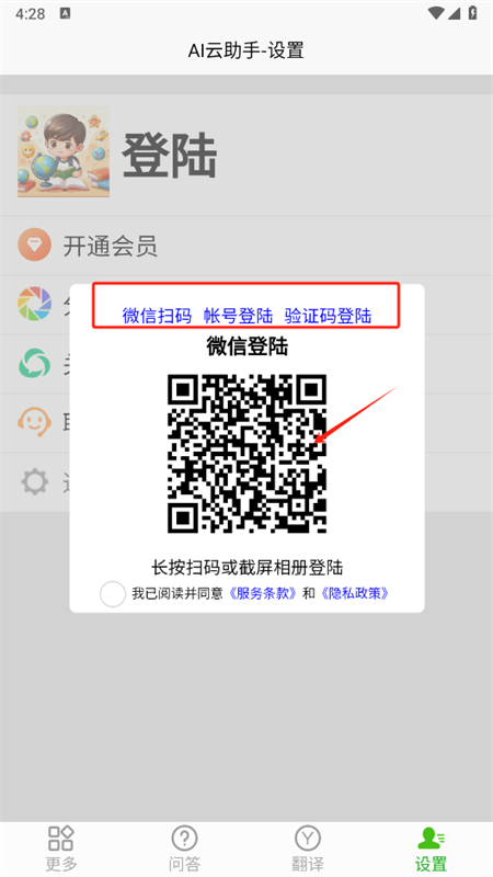 2、可以选择扫描或者验证码等登录方式,可以长按扫码快速登录