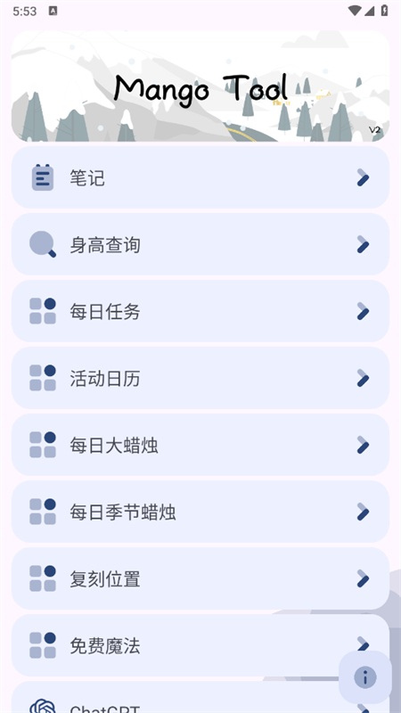 mangotool光遇官方下载最新版本是专门为光遇玩家们打造的游戏辅助工具,功能很全面,为大家提供了日常任务与蜡烛指引、复刻先祖位置查询、身高数据查询、免费魔法赠送等超多功能,帮助大家更好的完成游戏任务、获取更多资源,感兴趣的朋友们快来宝贝游戏网下载体验吧!
