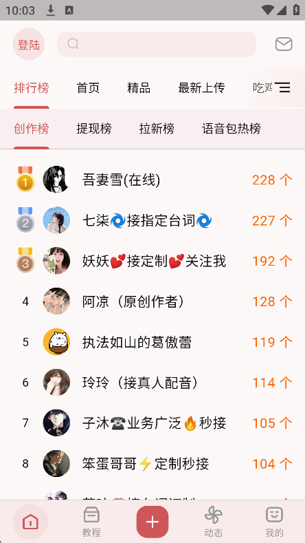 语音包分类展示:设有排行榜、精品、最新上传、吃鸡、DJ & 电音等分类板块,方便用户快速找到感兴趣的语音包。其中排行榜能直观展示热门语音包,“最新上传” 方便用户获取最新内容 。