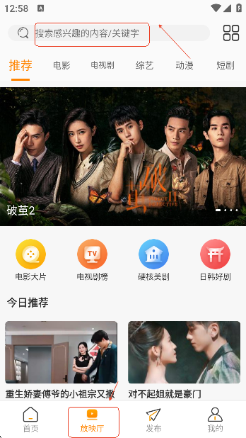 打开app,有观影需求的用户直接在放映厅界面搜索自己喜欢的影视资源