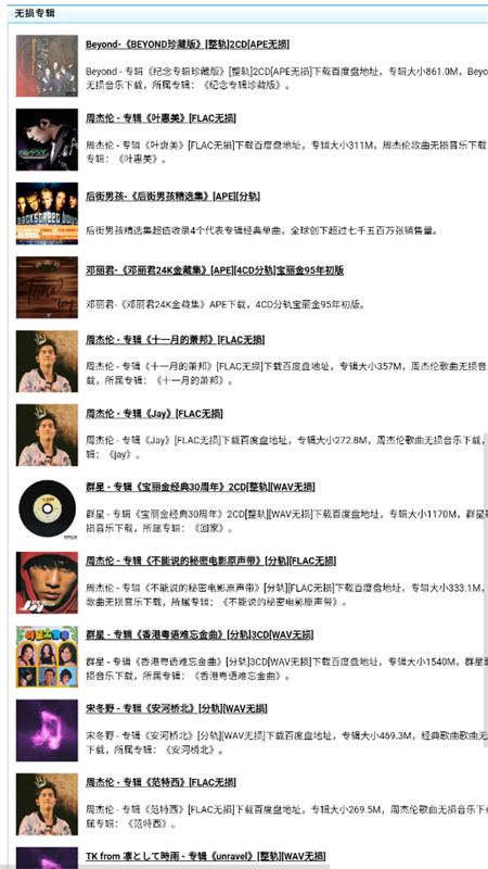 海量优质资源:网站汇聚了众多知名音乐人的专辑歌曲,像周杰伦、五月天、谭咏麟、张学友等乐坛巨星的作品皆在其中,为用户打造了一个丰富多元的音乐宝库。