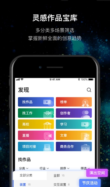 作品推送与浏览:每日推送3-5个新作品视频,涵盖装置、Mapping、VR、AR、交互设计等10个分类,方便用户了解新媒体艺术,用户可在“发现”页面浏览各类作品。