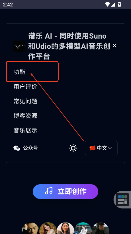 1、进入谱乐ai官方版首页,可以直接点击立即创作
