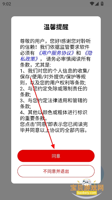 1、下载安装聆听音乐App后进入并同意用户协议;
