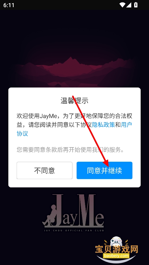 1、在宝贝游戏网下载安装JayMe软件安卓版,点击“同意并继续”进入界面