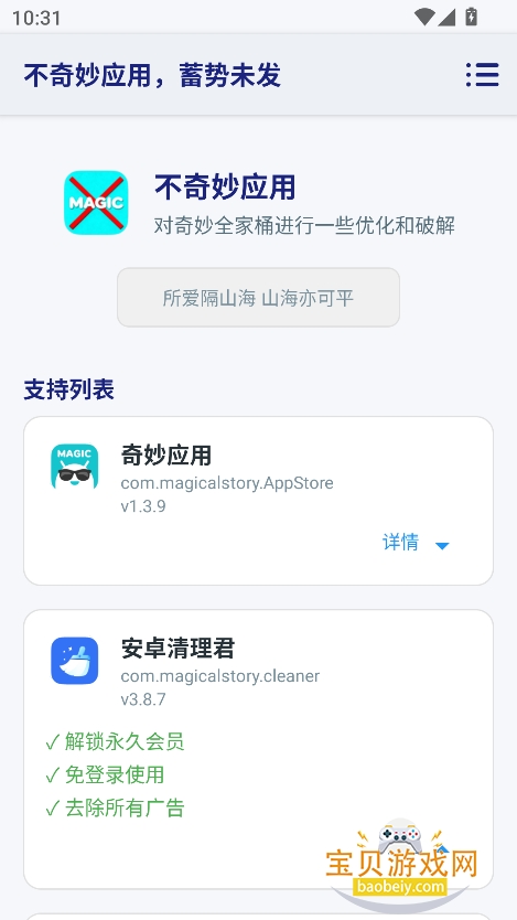 不奇妙应用模块最新版下载,一款去广告模块应用,聚焦“工具一站式获取”“会员功能解锁”“广告模块去除”三大核心需求,内置奇妙应用、安卓清理君、朝花夕拾、奇妙扫描、奇妙工具箱等多款高频实用工具,搭配模块管理器实现便捷操作,以干净清爽的界面消除广告干扰,为玩家们带来更纯净的玩机体验,需要的欢迎来宝贝游戏网下载体验吧!