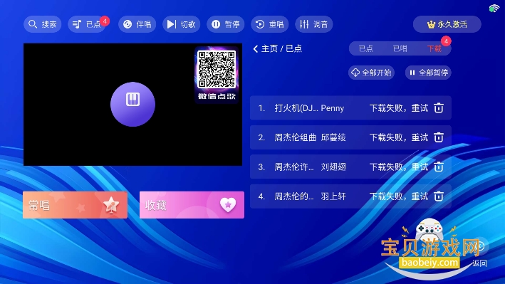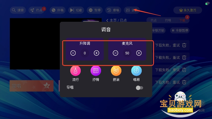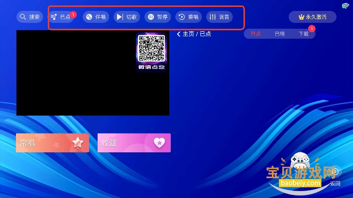 1、进入首页,可以查看已点歌曲,伴唱,以及切歌,暂停,重唱,调音等功能