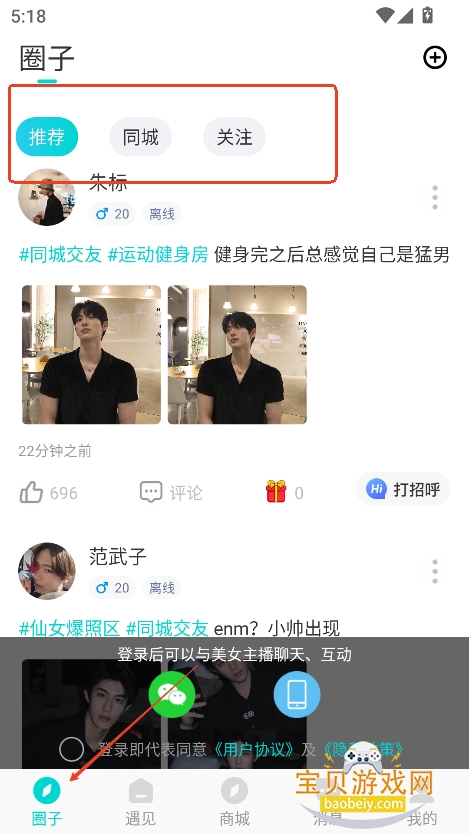 1、进入圈子,可以筛选同城,附近,以及关注的好友