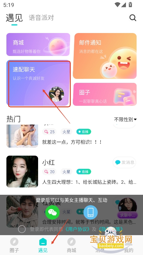 3、进入“遇见”板块,可以点击进入速配聊天,系统会随机玩家和你对话