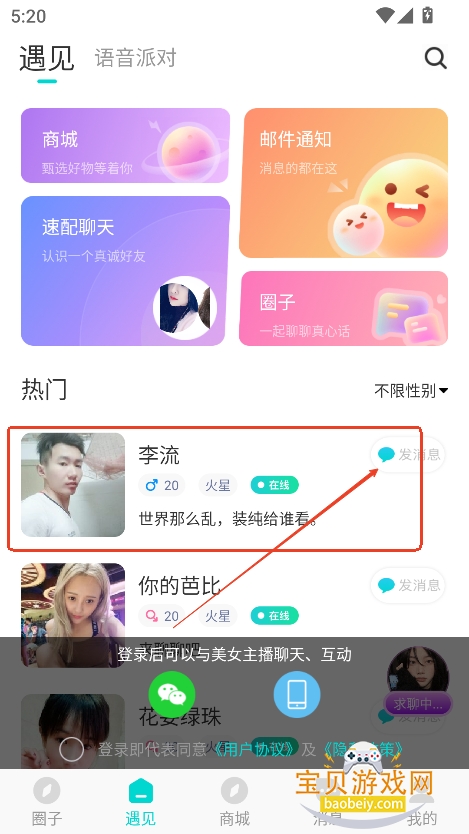 4、或者浏览到下方,进入热门板块,会推荐附近人群,可以直接点击和他聊天