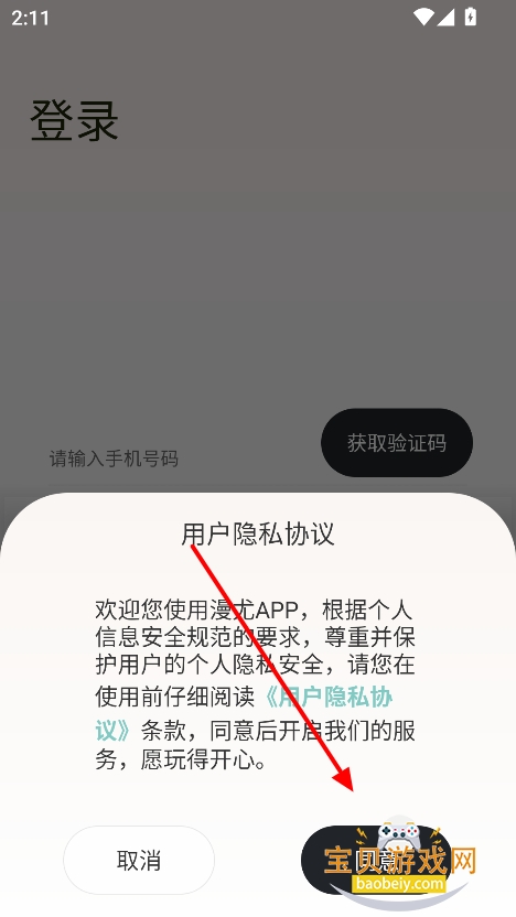 1、在宝贝游戏网下载安装漫尤手机版,点击“同意”进入界面