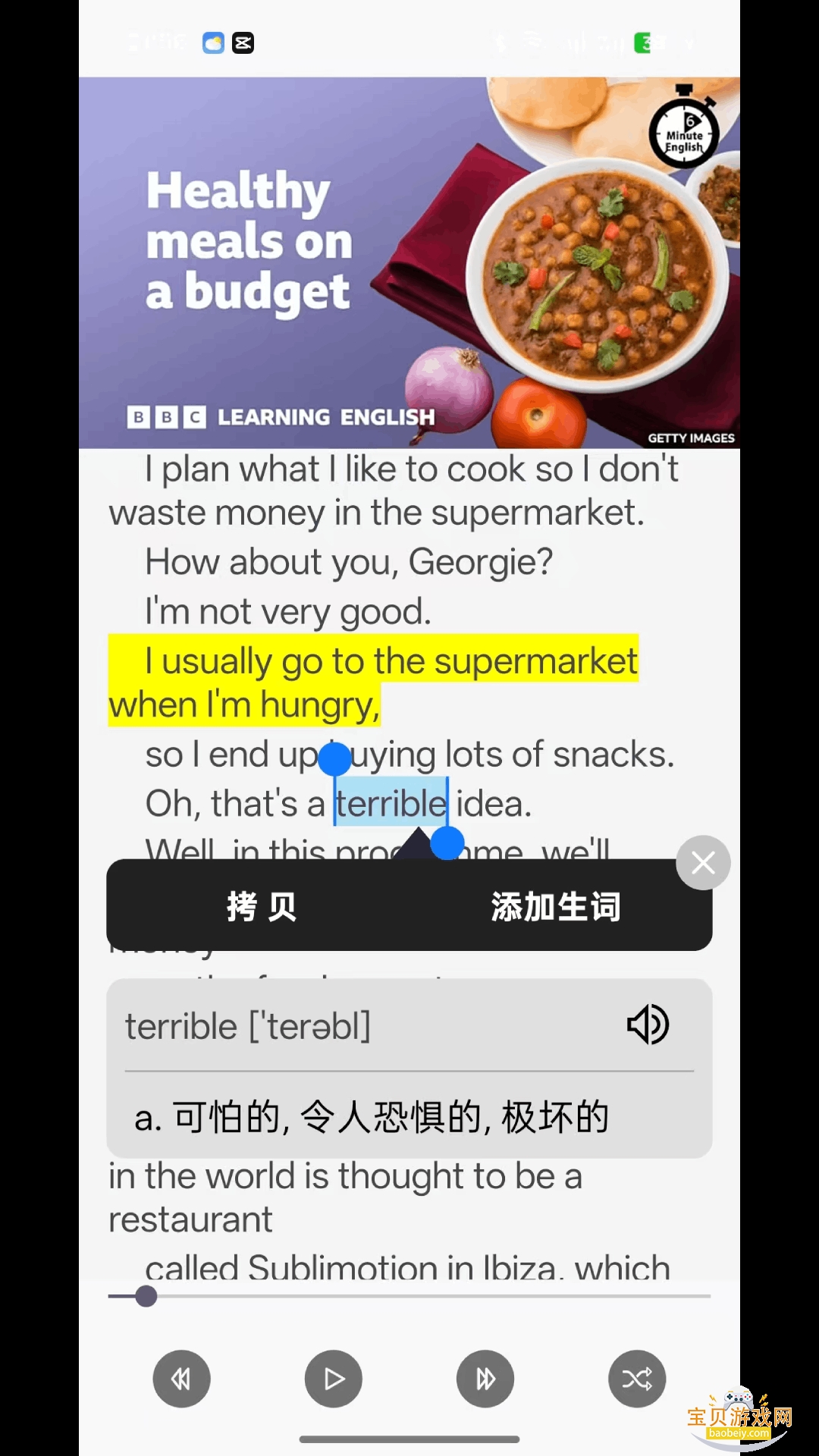 2.流畅播放英语音频,播放时同步高亮显示对应文本,助力发音与字形关联。