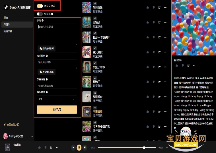 也可以选择自定义模式,可以输入歌词,风格跟标题,AI会根据你的歌词生成一首音乐。