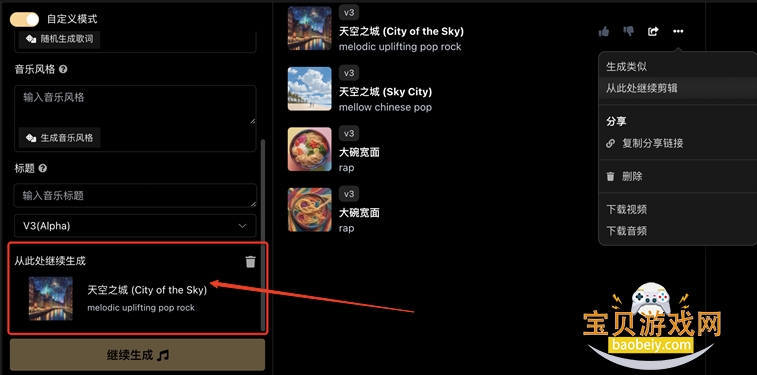 您可以使用继续生成功能扩展您喜爱的片段。你可以根据自己的意愿在歌曲中添加任意多个额外的片段,每个片段都需要额外的60秒。