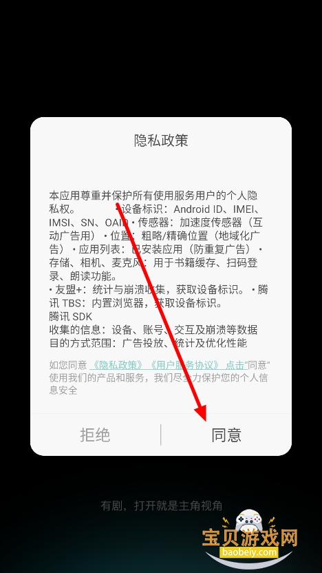 1、在宝贝游戏网下载安装有剧阅读安卓版,点击“同意”进入