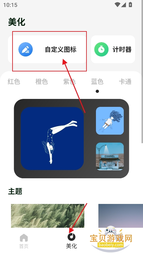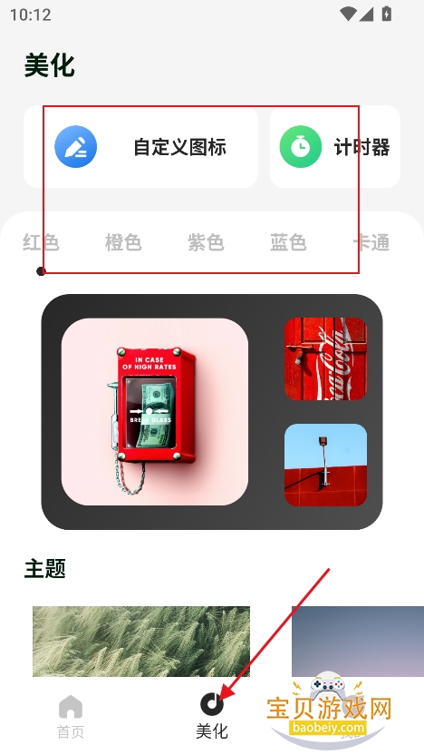 4、进入美化内容,提供图标,计时器等,还能够定制背景颜色,选择喜欢的主题,壁纸等