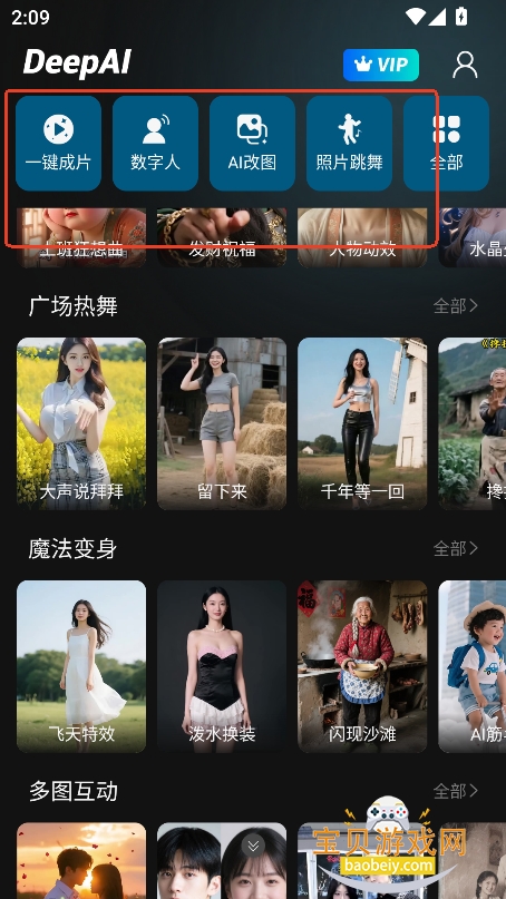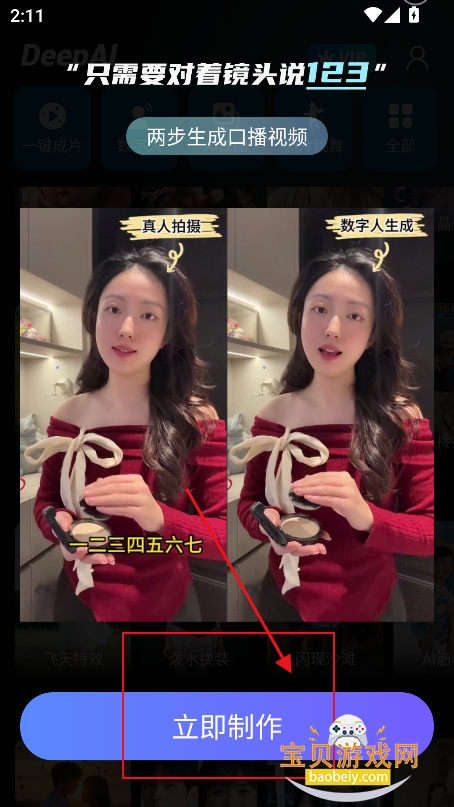 1、进入首页,提供一键成片,数字人,AI改图,照片跳舞等生成功能,任意选择一个功能即可
