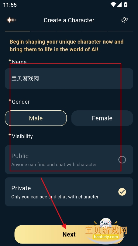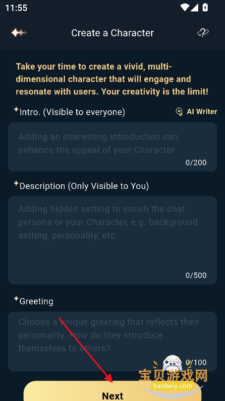 3、输入名称,以及人物设定,对话,开场白,性格特色等参数,点击下一步