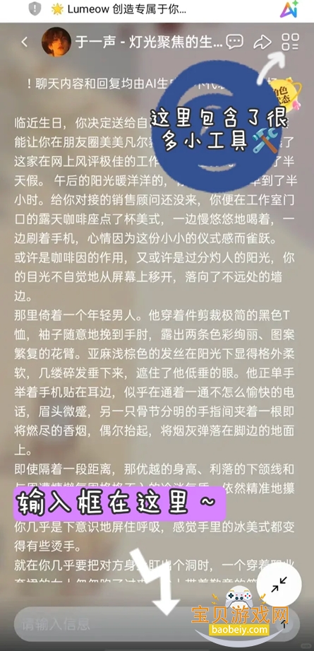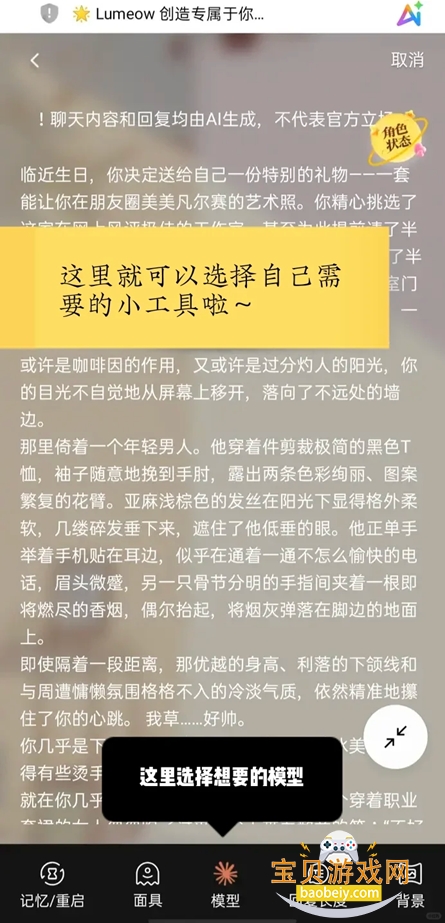 OC角色个性化定制:允许用户自定义专属OC角色,可设置角色的外形(发型、服饰、五官)、性格(温柔、腹黑、傲娇等)、身份(学生、医生、艺术家等)、背景故事,生成完全符合个人喜好的专属角色,满足个性化陪伴需求。