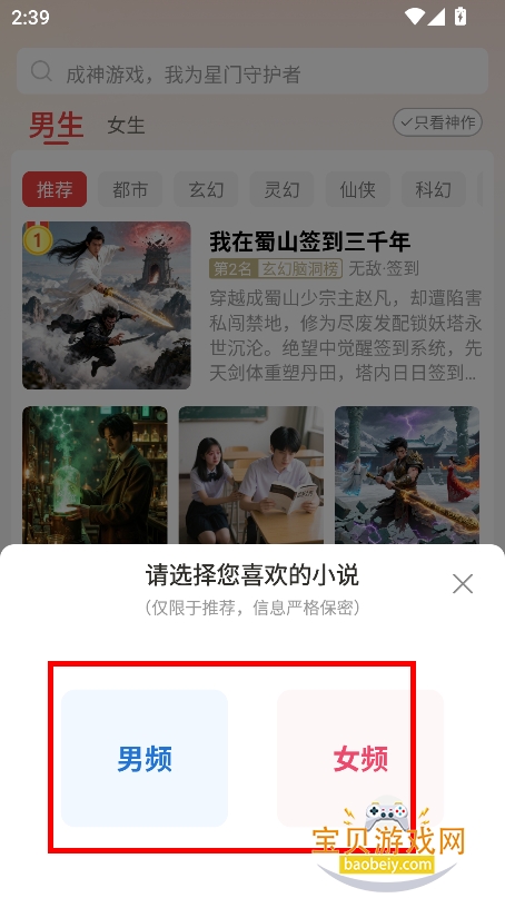 1、进入首页,首先筛选男频,或者女频阅读内容