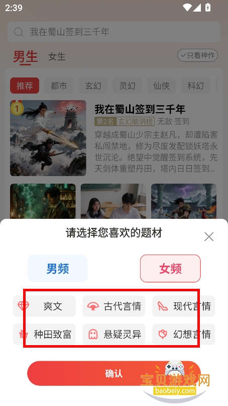 2、然后勾选喜欢阅读题材,类型,点击确认