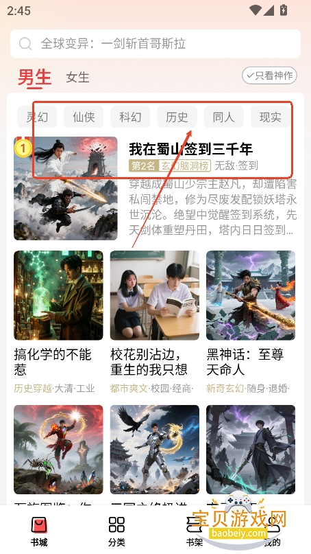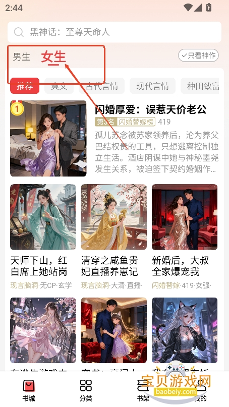 3、然后进入书城,还是可以切换男生,女生不同板块的小说内容