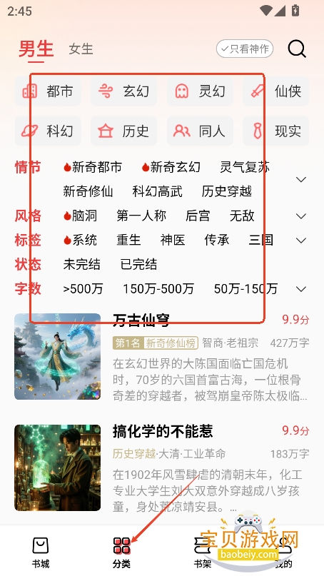 5、进入分类,还有更细致的小说标签可以筛选
