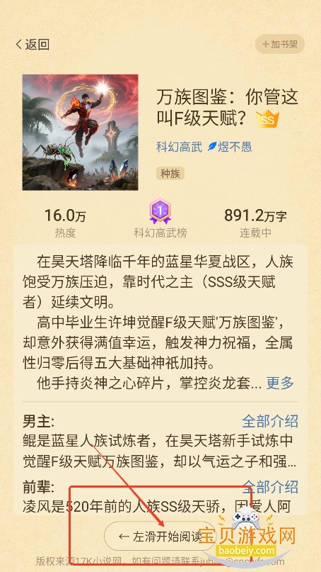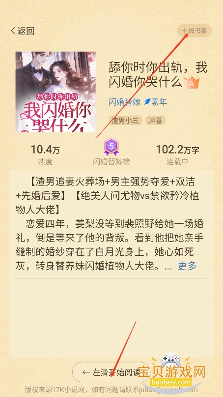 7、然后根据搜索结果,进入喜欢的小说界面,左滑开始阅读,右上角点击加入书架,可以保存到书架,方便下次继续阅读