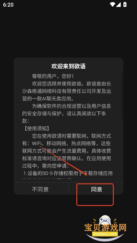 1、在宝贝游戏网下载安装欲语ai聊天软件,点击“同意”进入