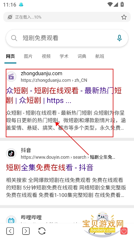 2、例如输入“短剧”关键词,然后选择下方搜索引擎