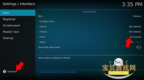 3、进入下方界面后,我们首先将Skin选项下的Fonts选项改为Aira based(如果没找到Fonts选项,先将左下角改为Standard)