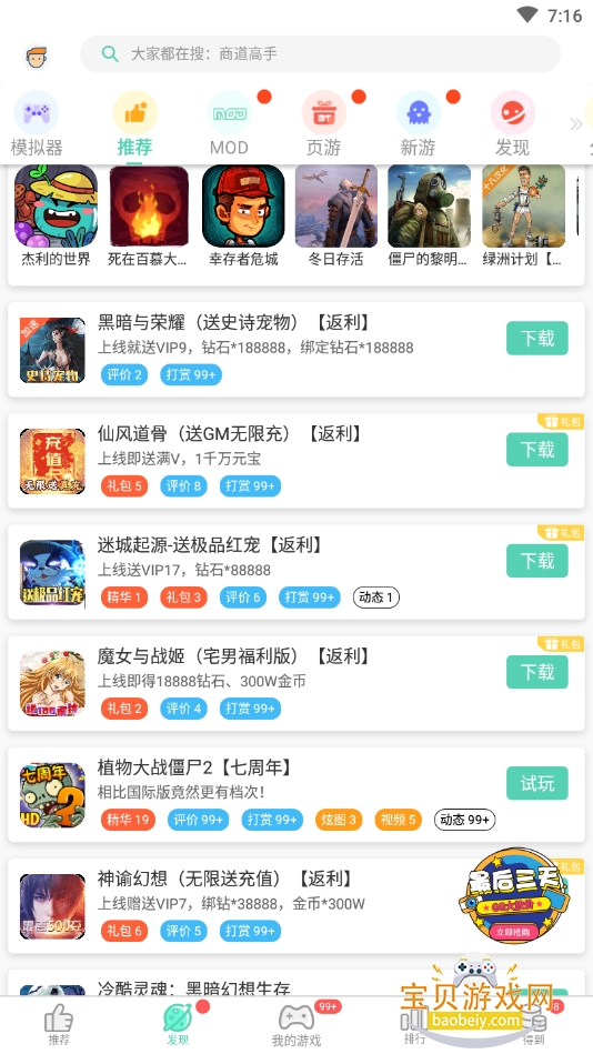 2、可以看到这里面的游戏非常多,随便一个游戏都能在这里找到。如果你也嫌麻烦了话,它还有个排行榜,让你在这里找到热门游戏。可以看到这里的种类很多有模拟器,mod,页游等等!