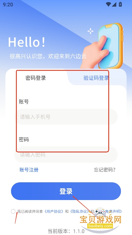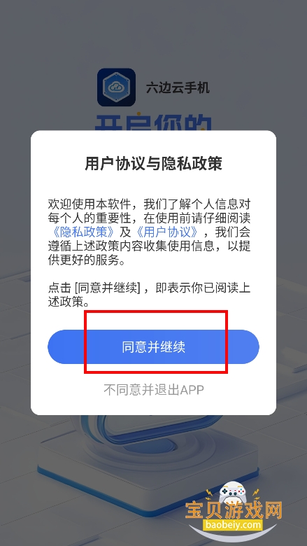 1、在宝贝游戏网下载安装六边云手机app安卓版,点击同意并继续进入