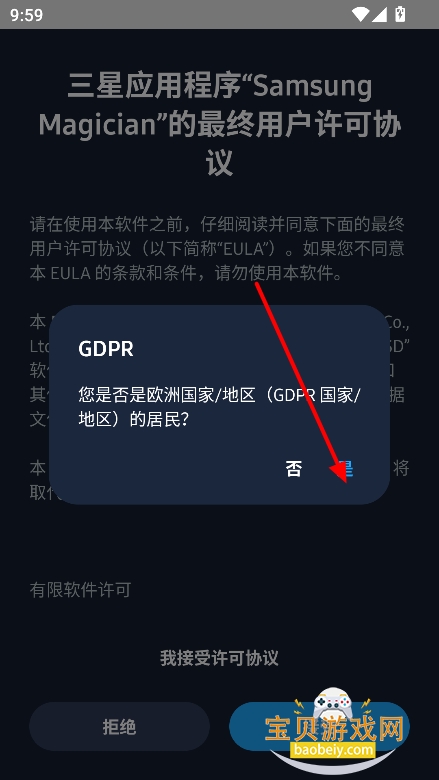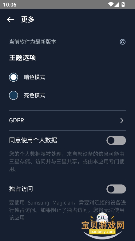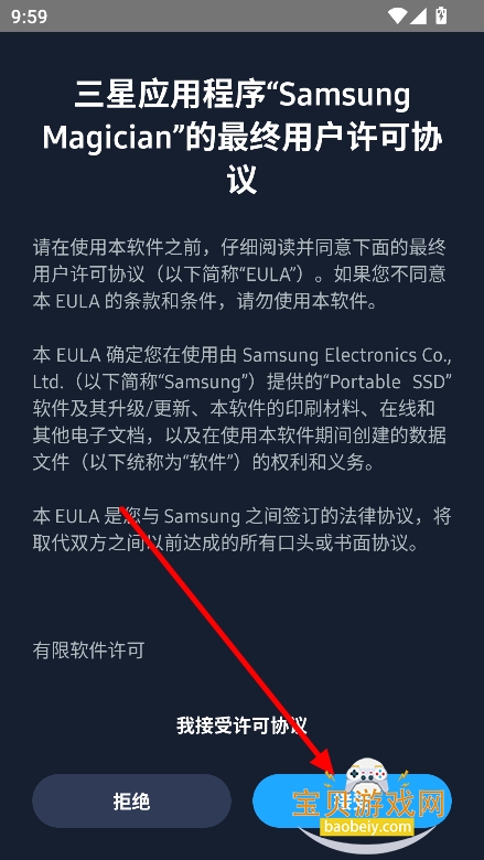 1、在宝贝游戏网下载安装Samsung Magician手机版,点击接受进入