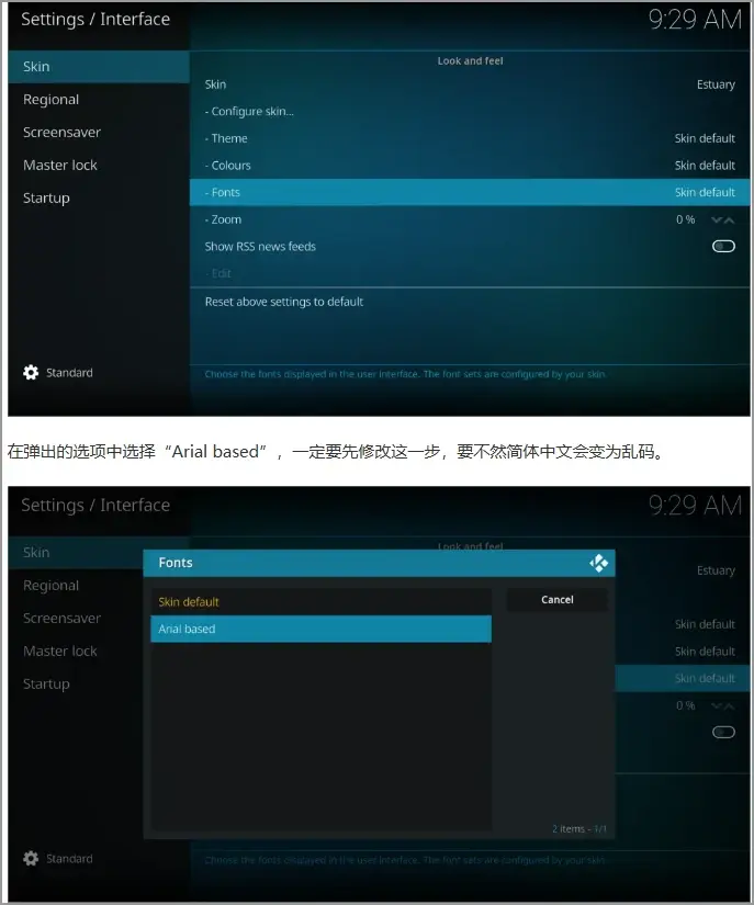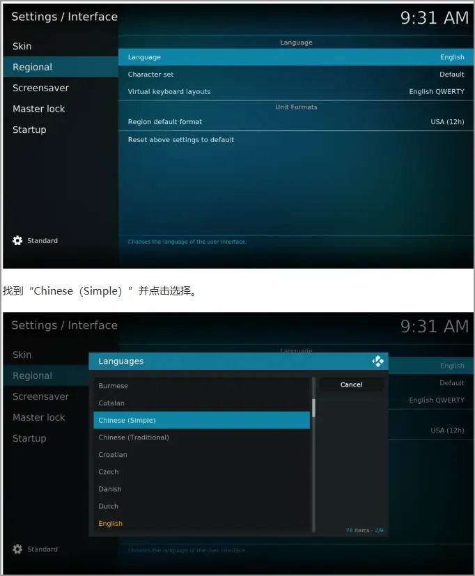 Kodi 安装完成之后,默认是英文语言,对于英语好的同学当然是手到擒来。但对于大多数朋友,简体中文还是更接地气。