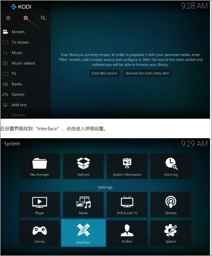 Kodi 安装完成之后,在主界面点击齿轮图标,进行 Kodi 的设置界面。