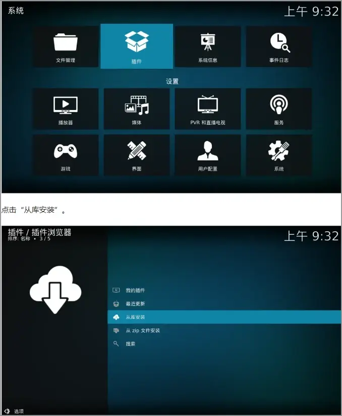 首先,获取和安装 PVR IPTV 客户端,这是 Kodi 的默认 IPTV 播放器。返回 Kodi 的设置界面,点击“插件”。