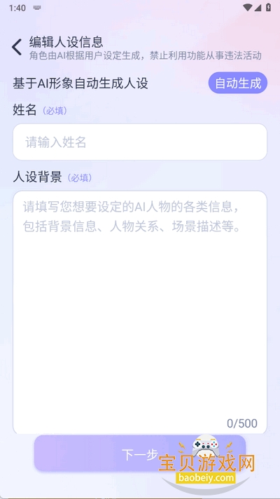 4、编辑姓名,人物人设,性格特点,开头语等,点击下一步
