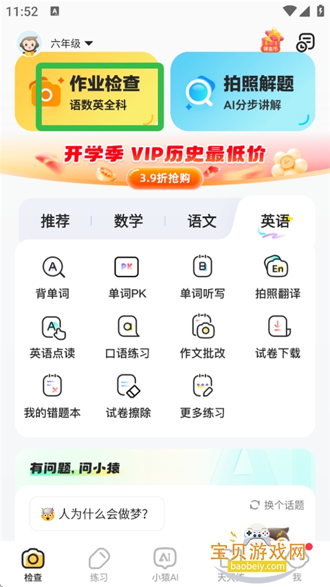 1、进入小猿AI app,在英语栏目下,点击【拍照翻译】。