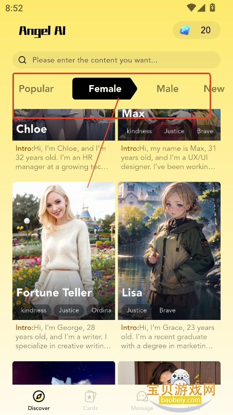2、切换不同的关键词标签,可以解锁更多虚拟角色