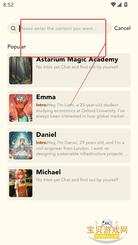 4、根据搜索结果,选择喜欢的角色进入,点击开始聊天