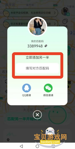 3、进入首页前,可以分享自己的匹配码给对方,也可以输入对方匹配码添加对方。