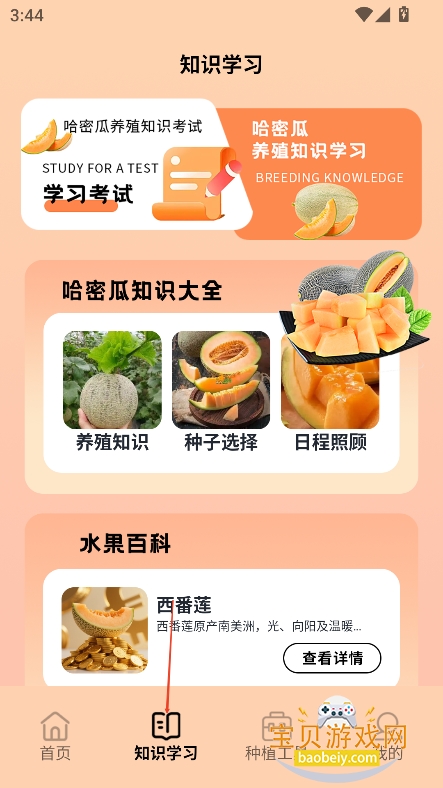 2、进入“知识学习”板块,提供哈密瓜知识大全,水果百科等