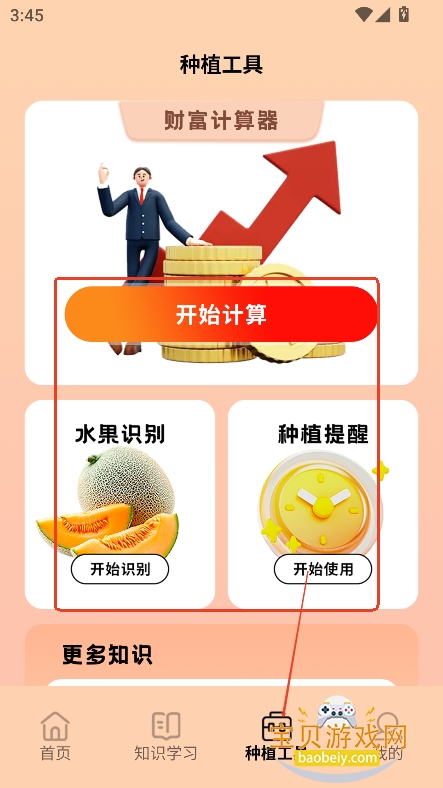 4、进入“种植工具”板块,提供水果识别,种植提醒,种植计算功能,可以直接在线使用
