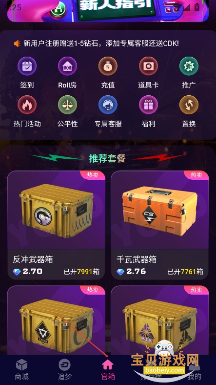 3、进入“官箱”板块,可以选择箱子在线开箱,还能够关注活动,查询各种游戏福利等
